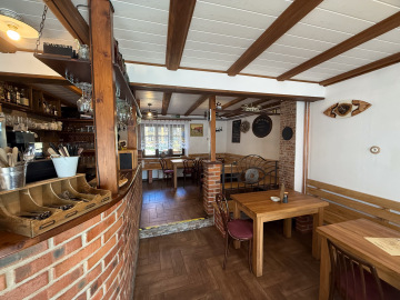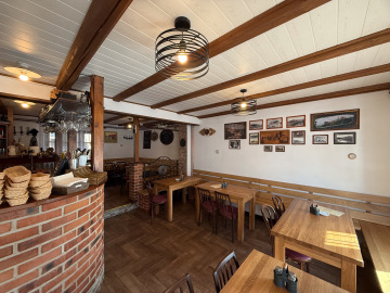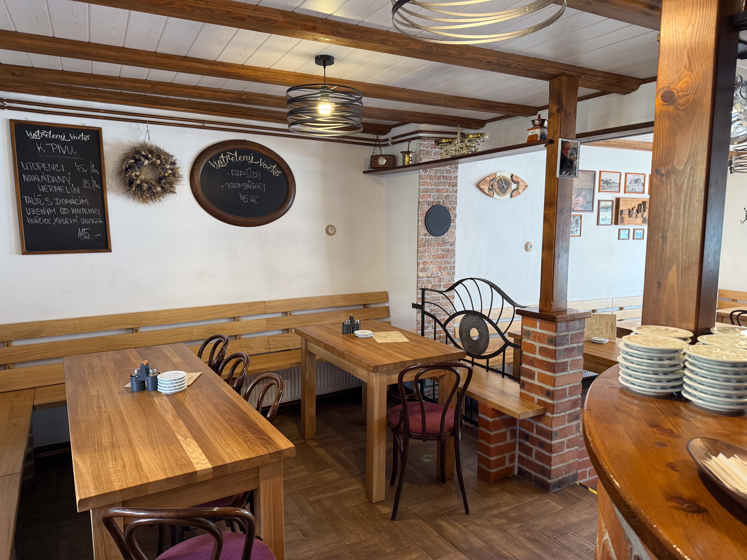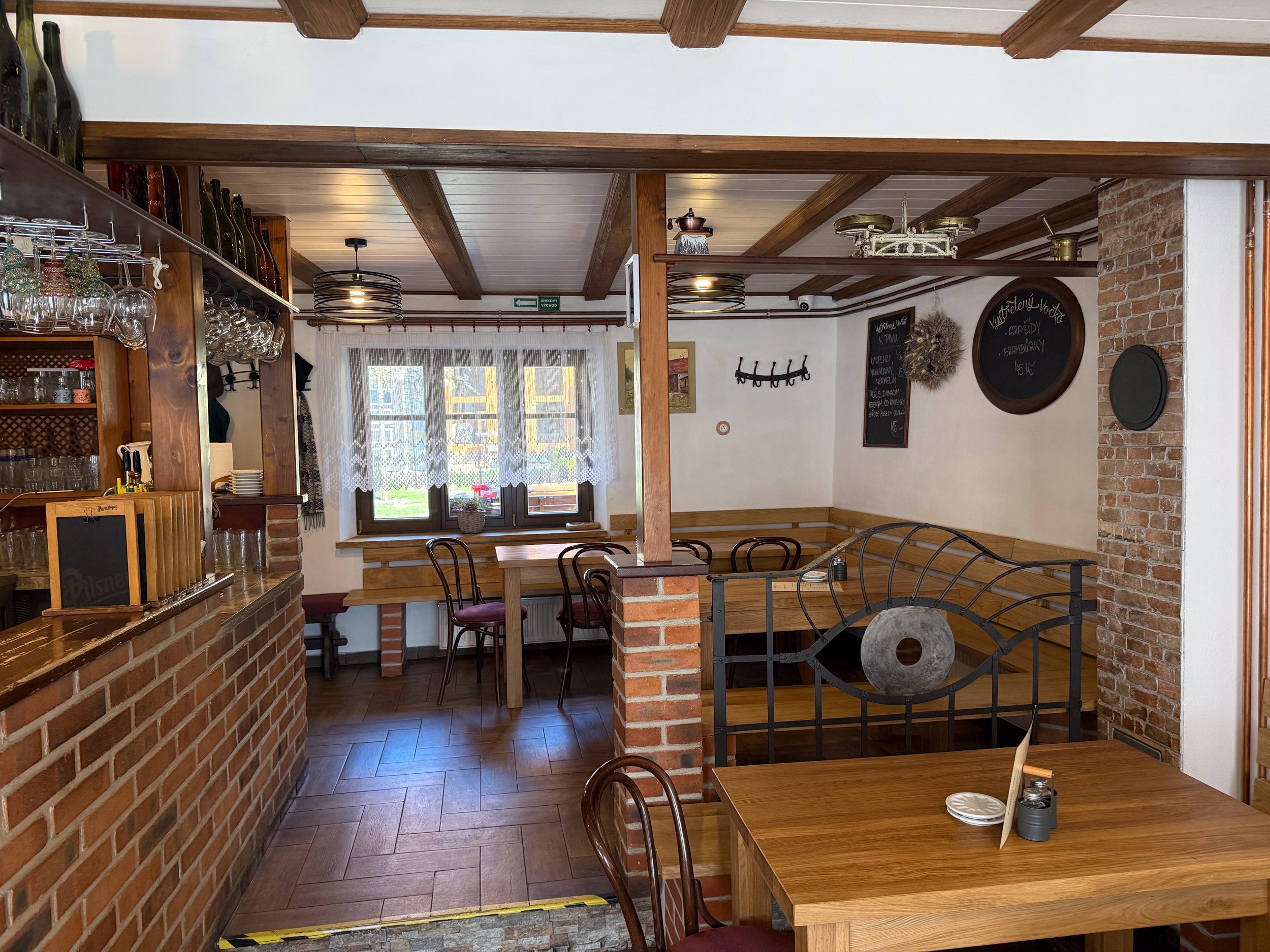 Interiér hostince je útulně zařízen. V létě můžete posedět také venku pod pergolou nebo na dvorku či stodole